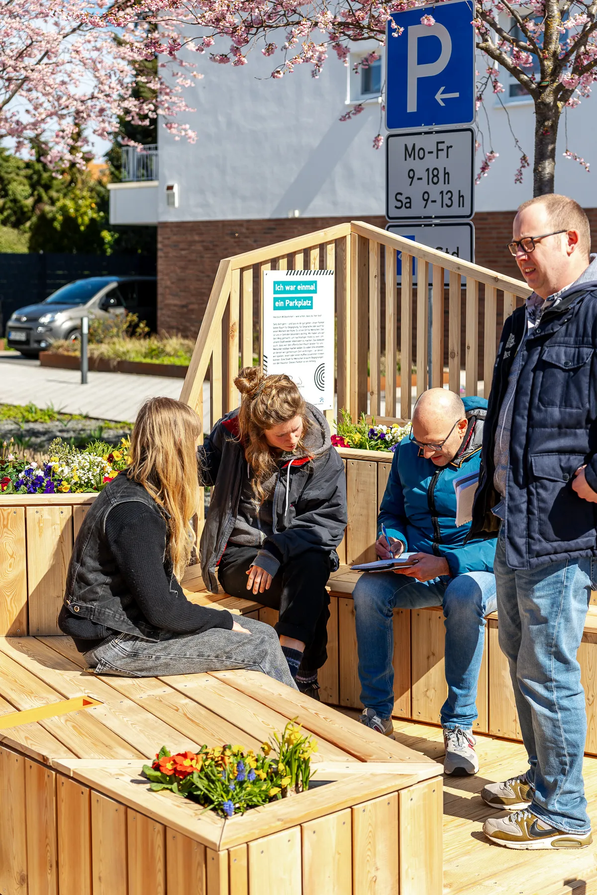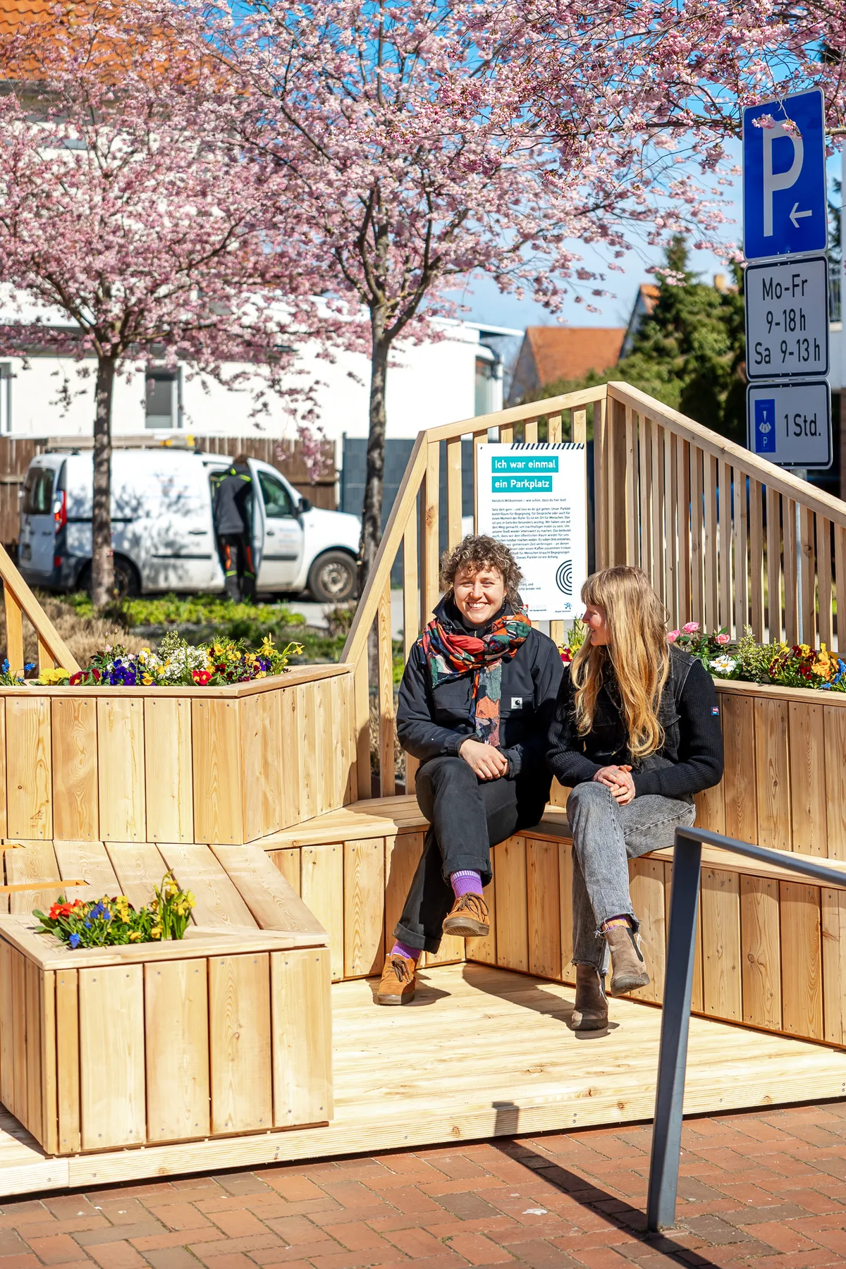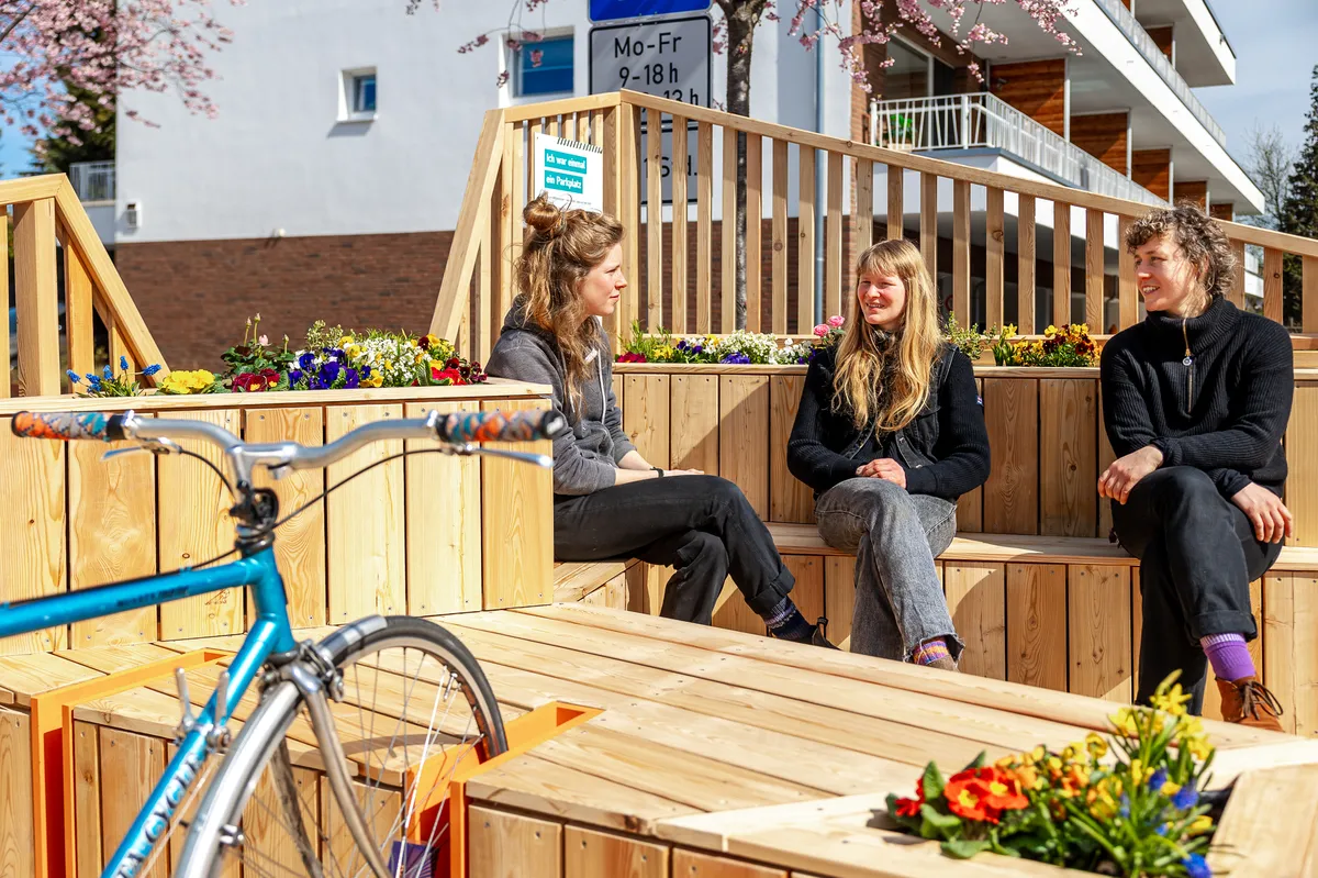 Ein hölzernes Parklet mit Sitzbänken, Blumenbeeten und einer gelben Fahrradreparaturstation steht am Straßenrand; daneben ein Fahrrad, im Hintergrund blühende Bäume und Wohnhäuser.