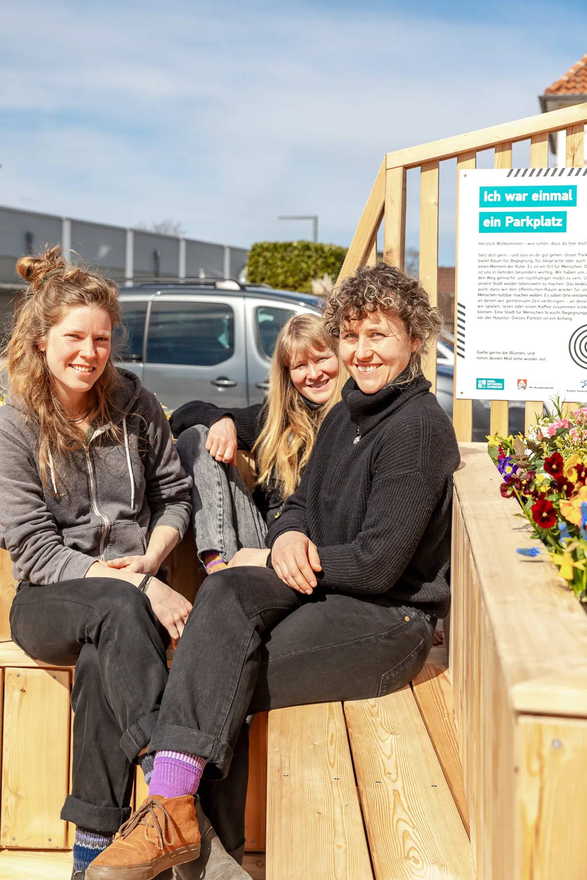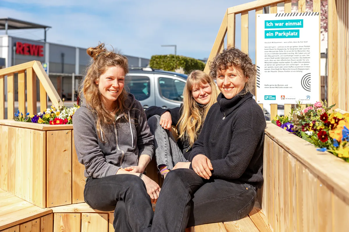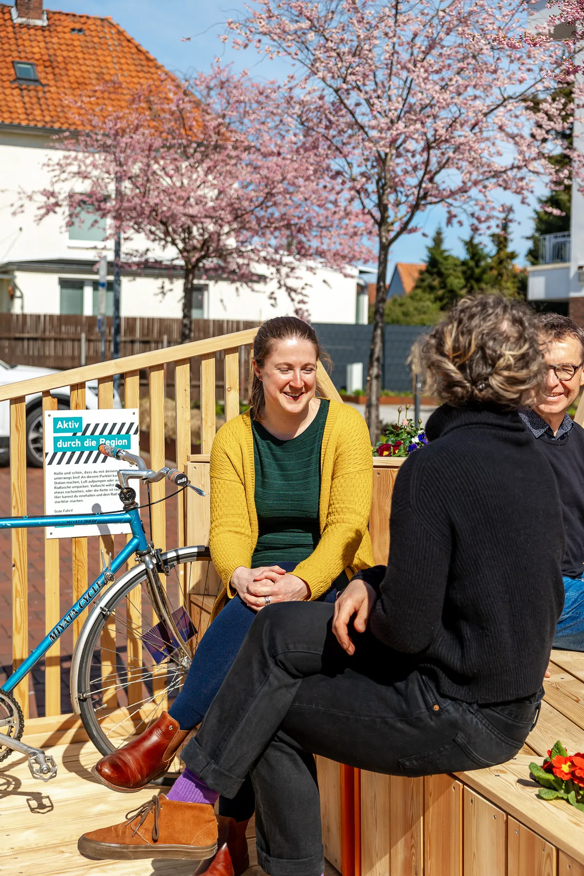 Ein hölzernes Parklet mit Sitzbänken, Blumenbeeten und einer gelben Fahrradreparaturstation steht am Straßenrand; daneben ein Fahrrad, im Hintergrund blühende Bäume und Wohnhäuser.