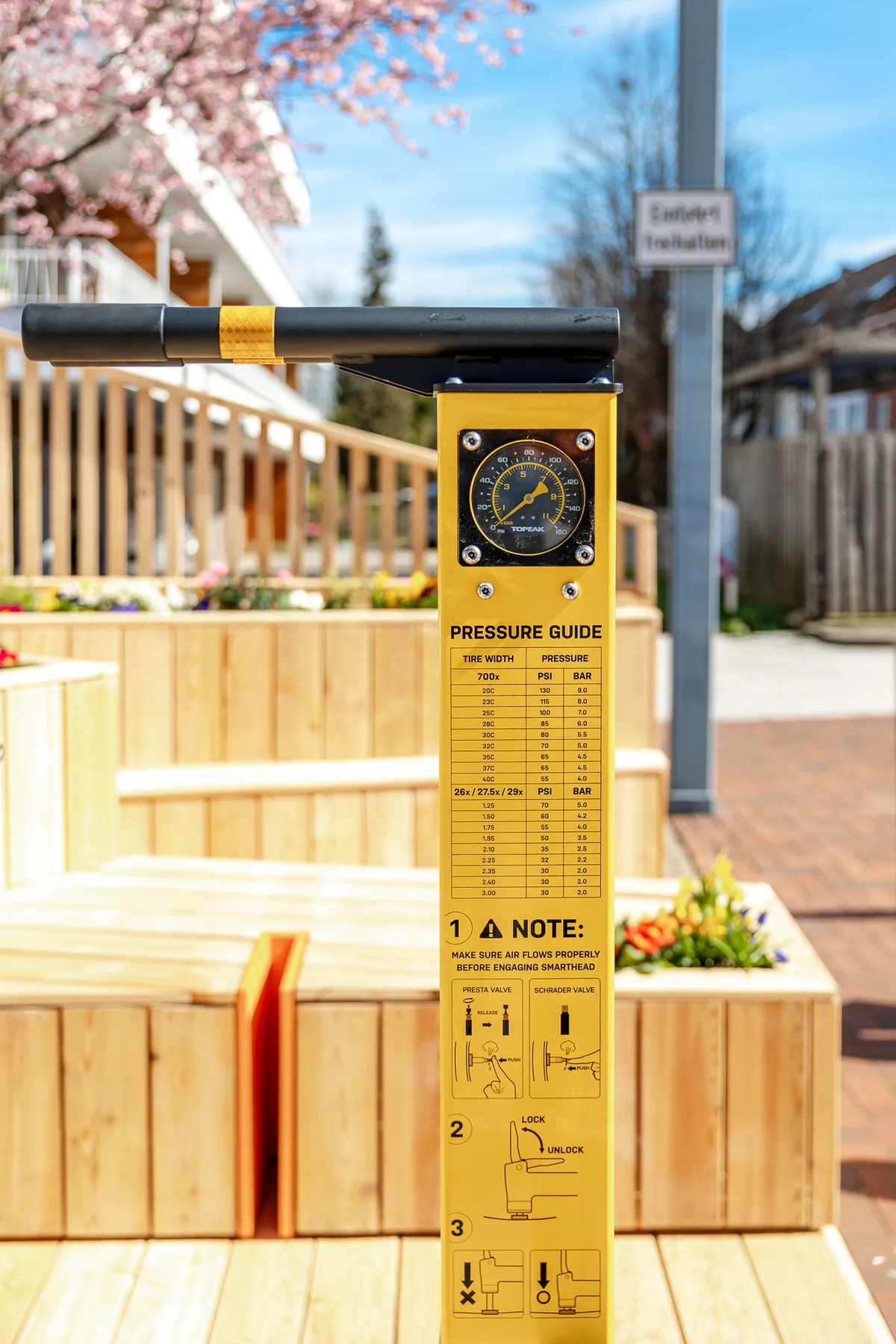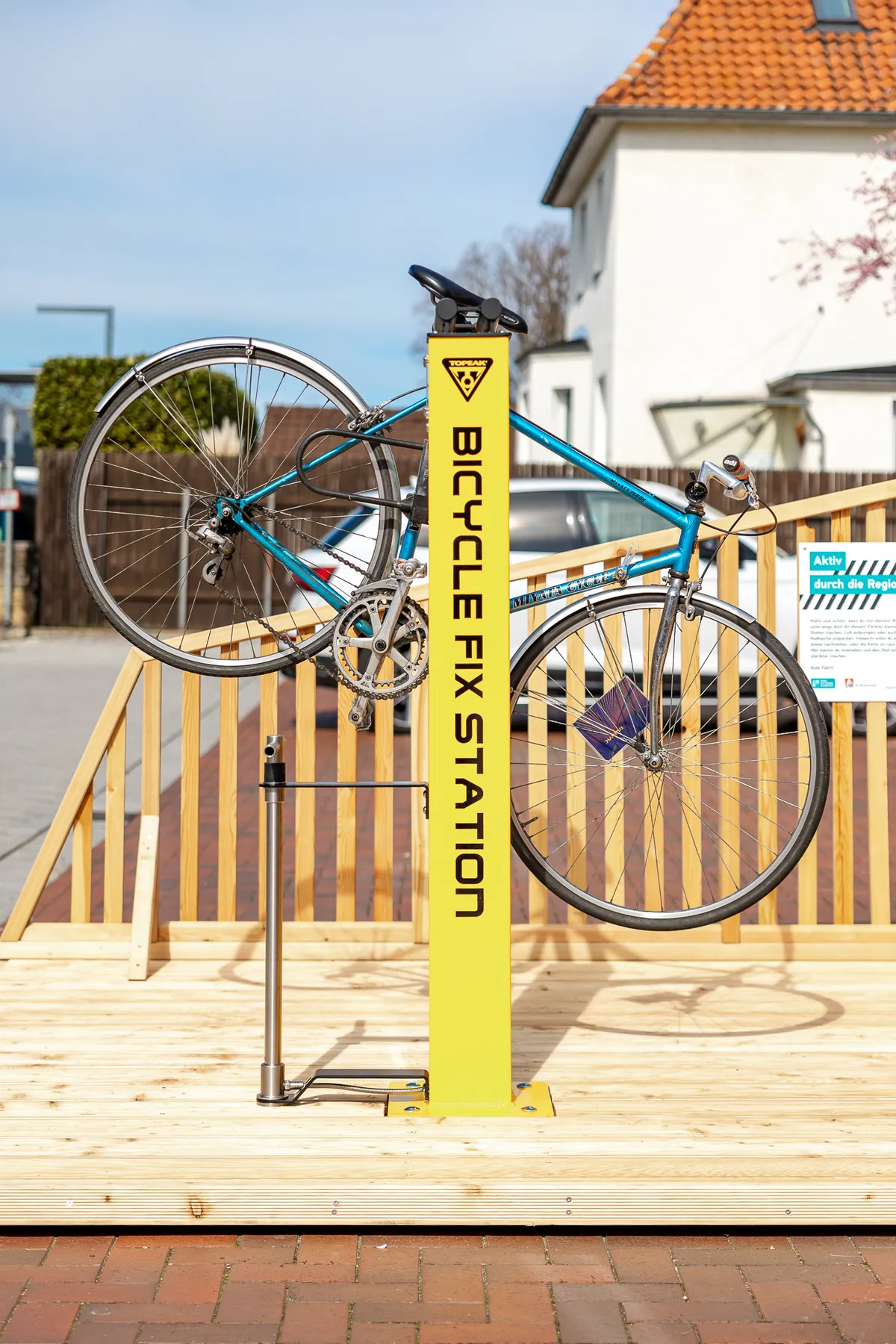 Diese Variante ergänzt das Angebot der vorgenannten um einen Arbeitsbereich für Radfahrende mittels Abstell- und Reparaturmöglichkeit fürs Fahrrad – die „Serviceinsel“ mit Luft zum Atmen und für die Reifen.