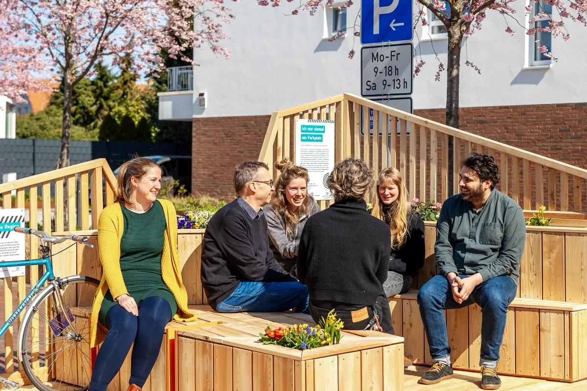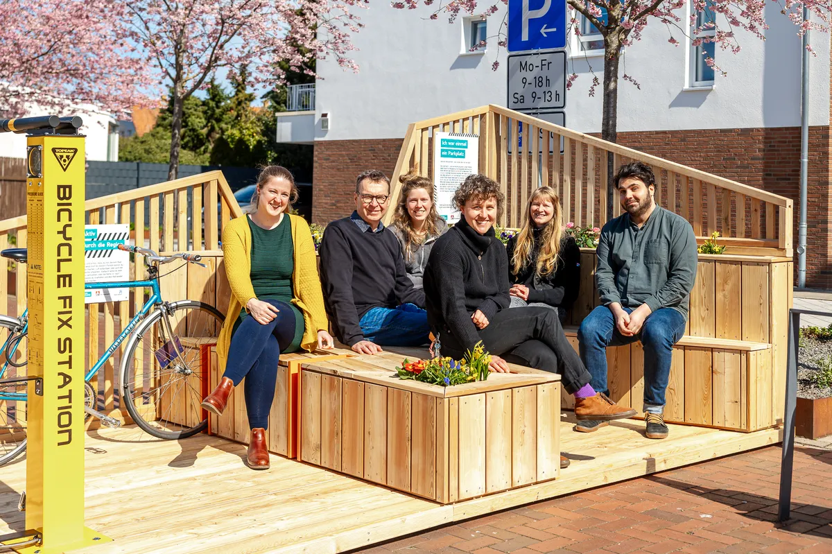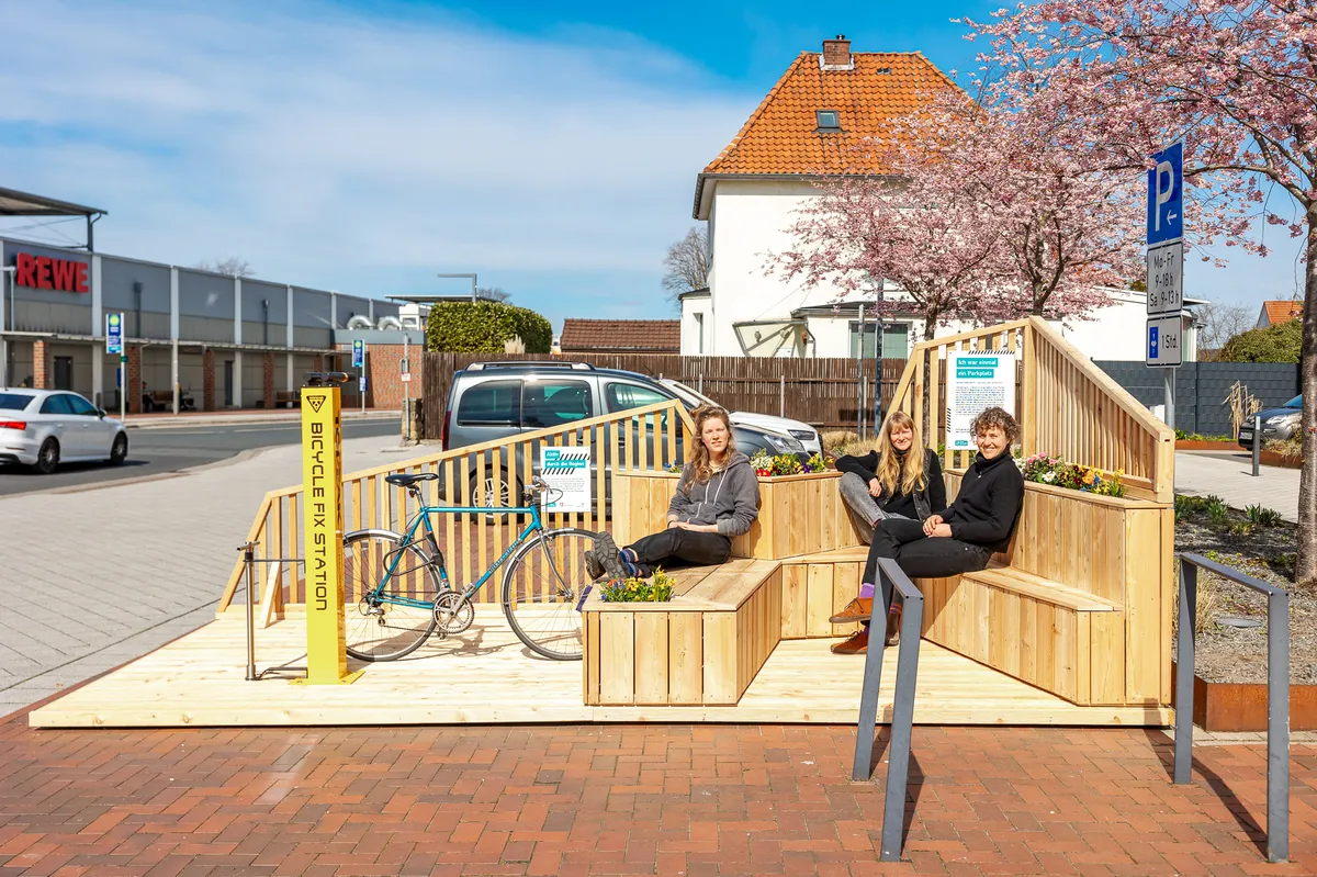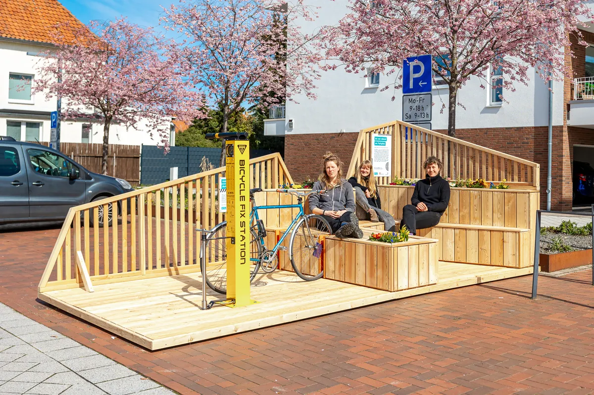 Ein hölzernes Parklet mit Sitzbänken, Blumenbeeten und einer gelben Fahrradreparaturstation steht am Straßenrand; daneben ein Fahrrad, im Hintergrund blühende Bäume und Wohnhäuser.